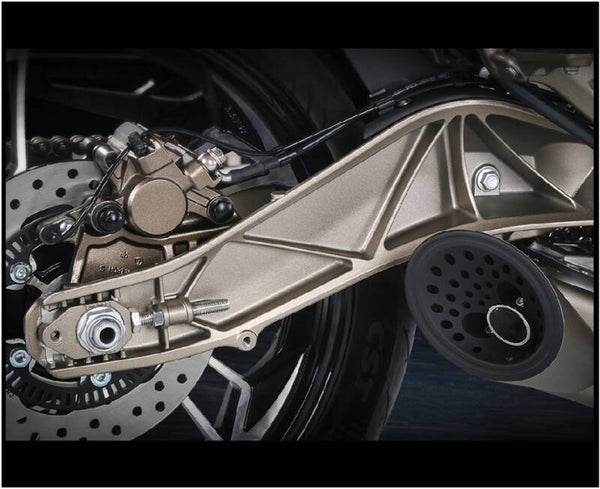 Der zentral montierter Monostoßdämpfer sorgt für eine sanftere Fahrt und bietet gleichzeitig hervorragende Kontrolle. Die Hinterradaufhängung ist mit Stickstoff unter hohem Druck gefüllt, um Stabilität auf langen Fahrten zu gewährleisten, und mit einer geringen Vorspannung eingestellt. Sie bietet hervorragenden Komfort.