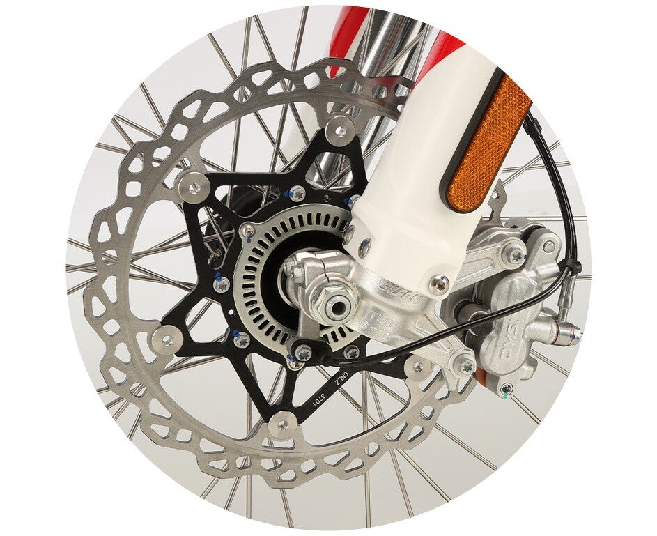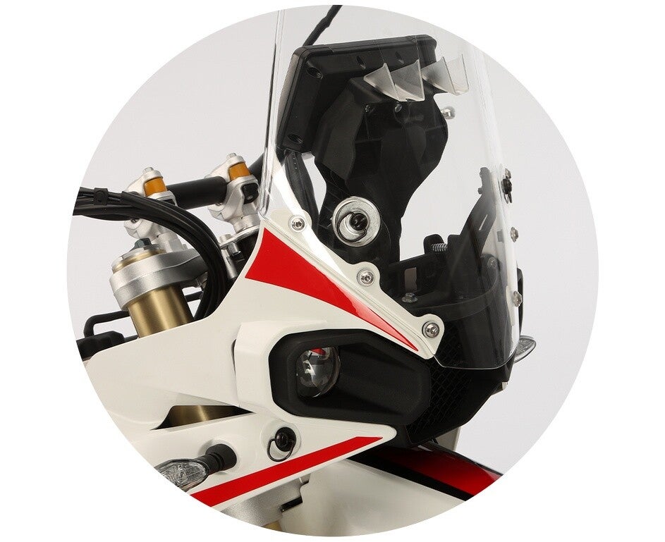 Mit den einstellbaren Upside-down-Gabeln mit 310mm (960mm Version) bzw. 270mm (910mm Version) resp. hinten 300mm (960mm Version) bzw. 250mm (910mm Version) Federweg, wird jeder Offroad-Trip zu einem Abenteuer. Das Taisko-Doppelkolbenbremssystem liefert eine brillante Perfomance auf jedem Untergrund.
