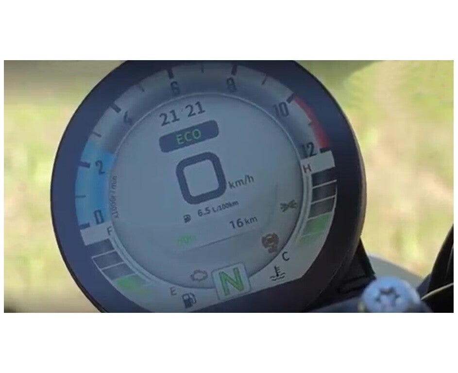Auf dem runden Bordcomputer der Gran Milano werden alle relevanten Informationen rund um das Motorrad grafisch dargestellt. Dazu zählt der digitale Tacho, Durchschnittsverbrauch, Reichweitenangabe, Gang- und Wartungsintervallanzeige.
