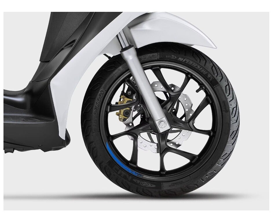 Der Piaggio Medley S besticht durch sein auffälliges Design mit schwarzen Verzierungen an den Stoßdämpfern, dem Soziushaltegriff, dem inneren Beinschild, der Fußablage und der Sitzbank mit passenden Nähten. Tiefe, matte Farben prägen sein Aussehen und unterstreichen seinen sportlichen und dynamischen Charakter, während die blauen Aufkleber auf den Felgen und der vorderen Krawatte den Familiencharakter unterstreichen.